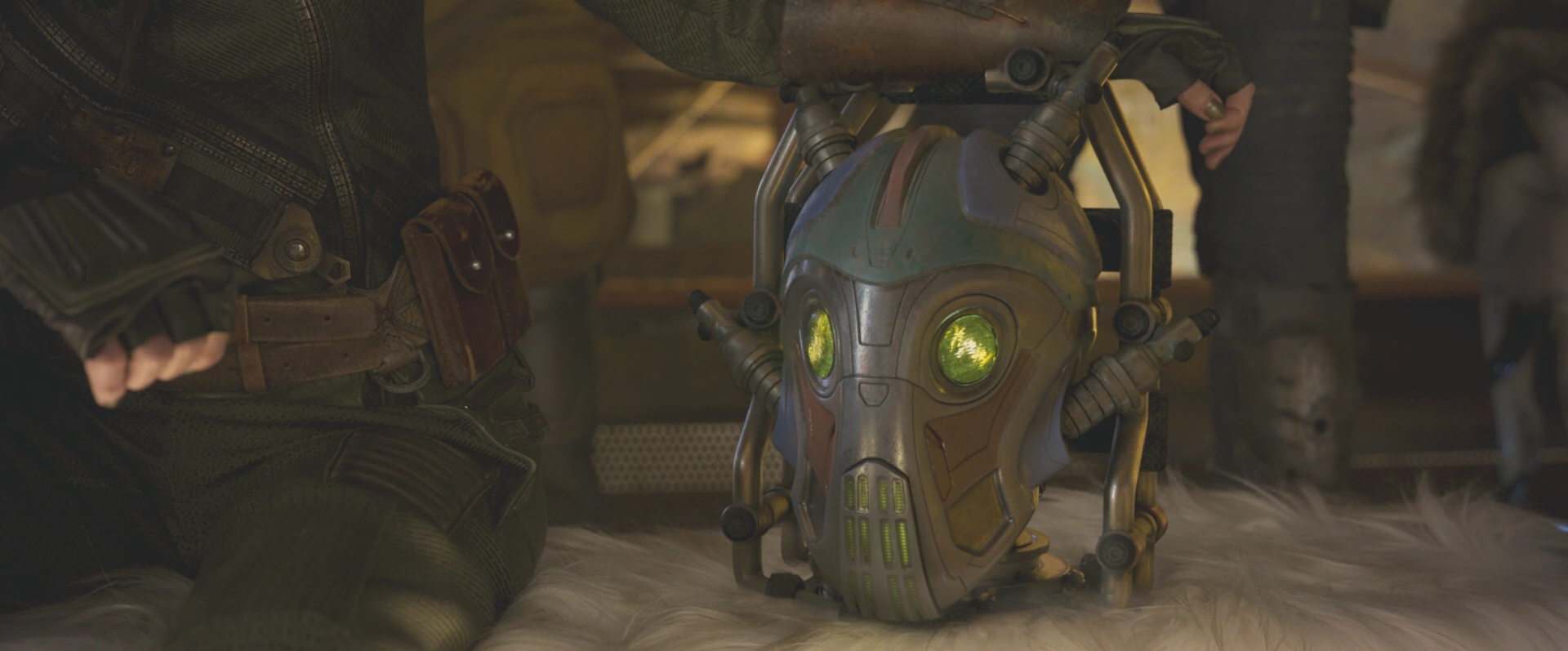 The concept of the character is that her head can fit on any robot. Mainframe is a robot head in Guardians of the Galaxy Vol.