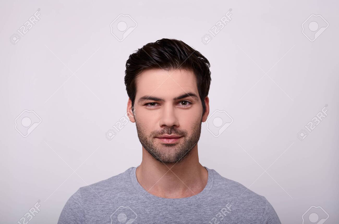 A Handsome Brutal Young Man With Dark Hair Brown Eyes A Light Beard In A Gray T Shirt Stands On A Gray Background And Looks Straight Harizmatch Brutal White Guy Stock Photo Picture