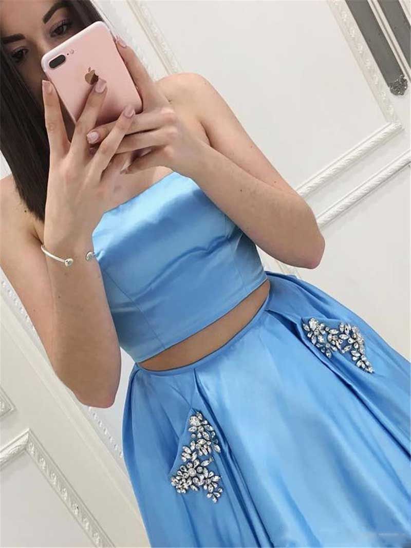 2018 New Light Blue Two Piece Prom Dress Strapless Beaded A Line Satin Pockets Floor Length Arabic Evening Wear Gowns Party Formal From Weddingplanning 58 01 Dhgate Com